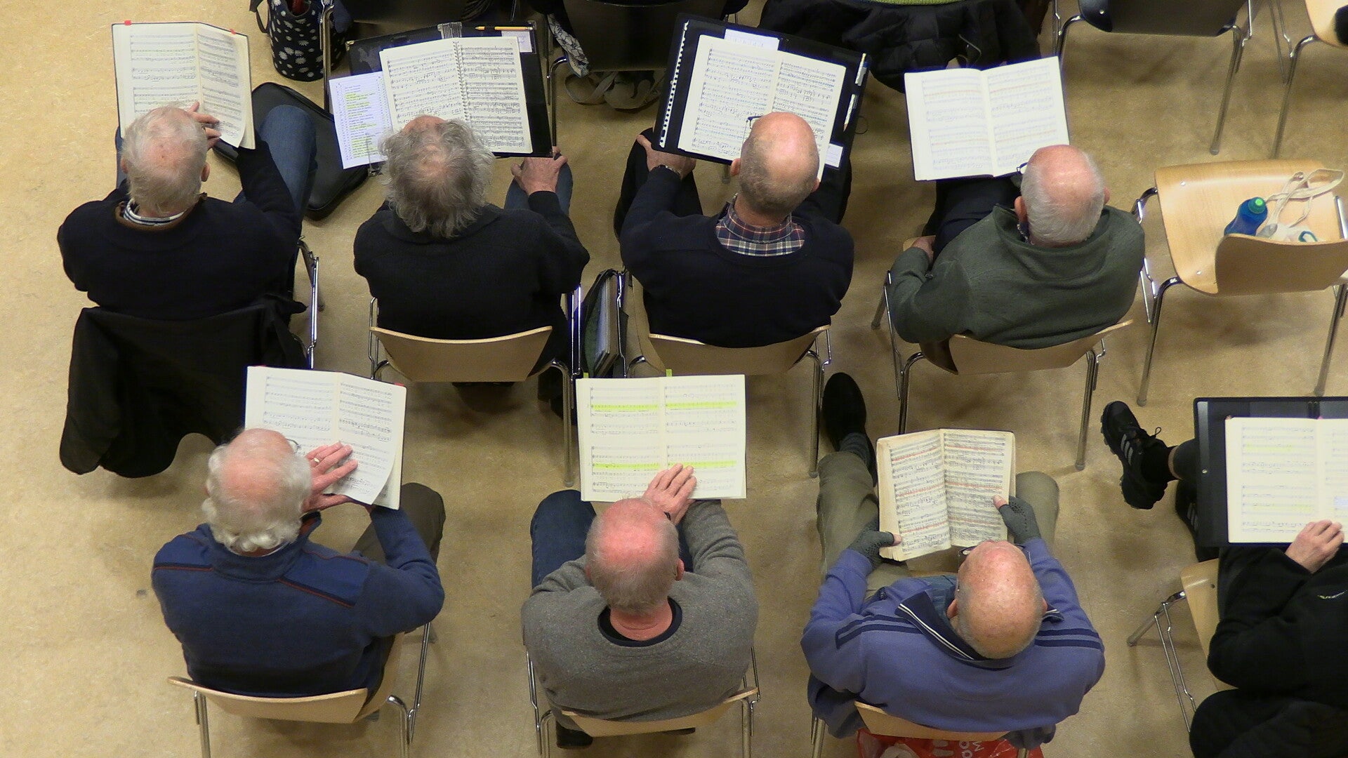 Wij repeteren in de aula van het Regius College in Schagen, een fijne ruimte om te repeteren. Het koor bezit een eigen vleugel, de dirigent studeert van achter de vleugel de partijen met ons en vertelt veel over het stuk en de componist. Als we geluk hebben laat hij ons meegenieten van een stukje muziek, want naast onze geliefde dirigent is Pieter-Jan ook een begenadigd pianist.