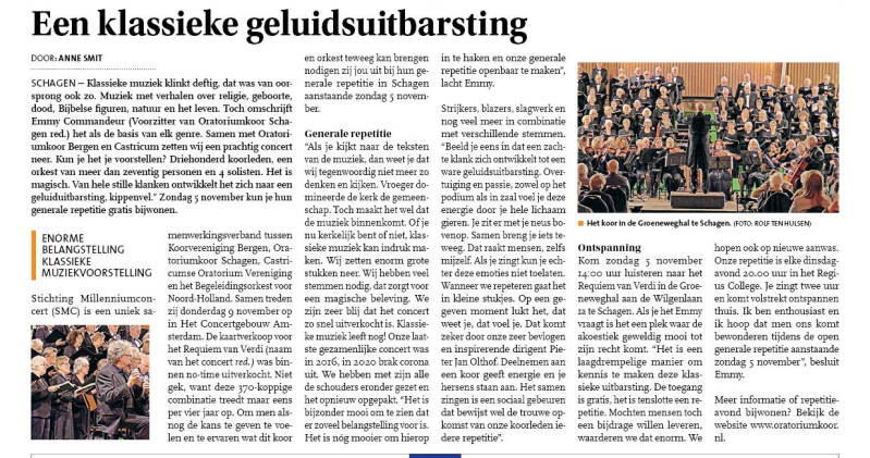 Jordy Kuys, de verslaggever/redacteur van Noordkop Centraal interviewde voorzitter Emmy Commandeur en dirigent Jan-Pieter Olthof, tijdens de repetitie van de concertuitvoering van het Requiem van Verdi.